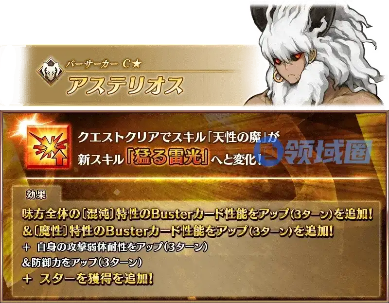 小牛本次强化的是2技能,【天性之魔】改为【猛烈的雷光】,追加提升【混沌】特性的己方全体20%~30%红卡性能3回合,提升【魔性】特性的己方全体20%~30%红卡性能3回合,追加获得10~20个暴击星效果。