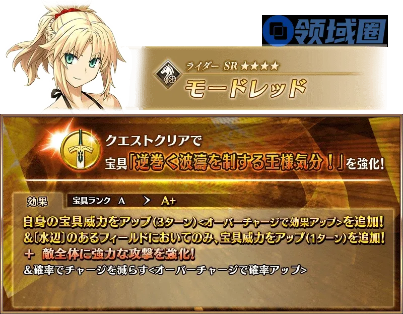 骑小莫本次开启的是宝具本,宝具倍率由450%~750%提升至600%~900%,追加宝具前提升自身10%~30%宝具威力3回合(效果随OC等级提升),在【水边】场地上时,提升自身20%宝具威力1回合。