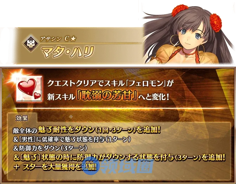 舞娘本次强化的是2技能,【费洛蒙】改为【耽溺的芳甘】,追加降低敌方全体魅惑耐性1次·3回合,赋予处于【魅惑】状态的地方防御力下降20%~30%状态3回合,获得20~30个暴击星。