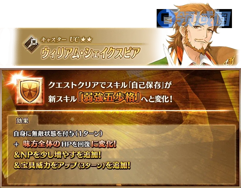 莎士比亚本次强化的是2技能,【自我保存】改为【弱强五步格】,原本的回血效果改为全体效果,追加增加己方全体10%NP,提升全体10%~20%宝具威力3回合效果。