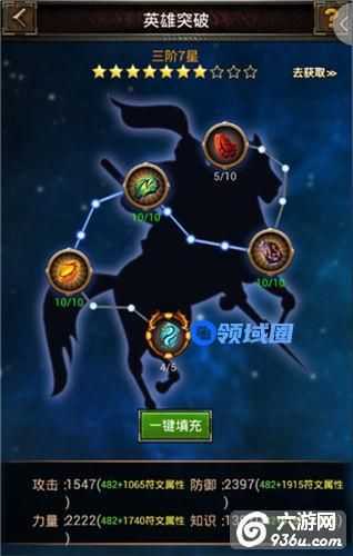 点击屏幕下方的“突破”按钮,进入英雄突破功能,将锻造出的材料一键填充即可。每一阶段共有10颗星星,突破一次点亮一颗,10颗全部点亮,晋级到下一阶段。