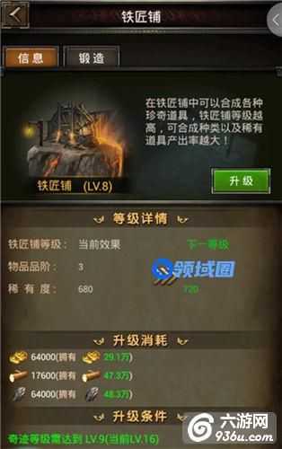 在铁匠铺中可以合成各种珍奇道具,铁匠铺等级越高,可合成种类以及稀有道具产出率越大!