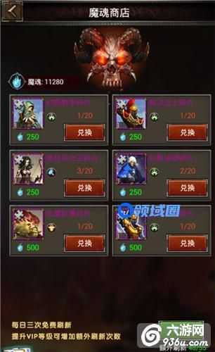 快速累积佣兵的必备之所,出售各类紫色佣兵碎片。每天共有55次刷新机会,前三次免费刷新,提升VIP等级可增加额外刷新次数。刷新一次消耗100魔魂。魔魂获取途径来自佣兵分解系统,或完成游戏内其他任务和副本可得,还可在矿洞内采集。