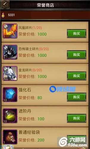 出售日常材料及专属紫色佣兵、装备碎片。日常材料包括强化石、进阶丹、经验袋。可通过荣誉值购买,在竞技场中可获得大量的荣誉值。