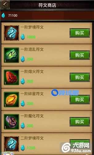 出售不同等级的各色符文,符文主要用于英雄突破,不同颜色的符文分别代表着攻击、防御、力量、知识这四种属性。可用符文精华进行购买,符文精华获取途径来自铁匠铺,锻造失败1次可得到精华*50个