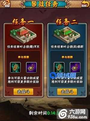 国战任务是《武圣赵子龙》特色国战玩法里面的一种,每天20:00开始,任务的目标是占领一次一个敌国的指定城池,并且守住另一个城池,奖励是大量的荣誉。