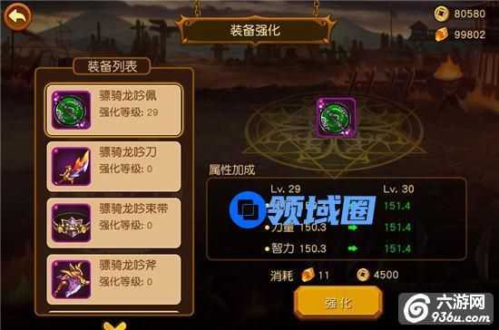 点击主界面英雄按钮,进入武将信息框后,选取装备,可以在右边看到强化按钮。