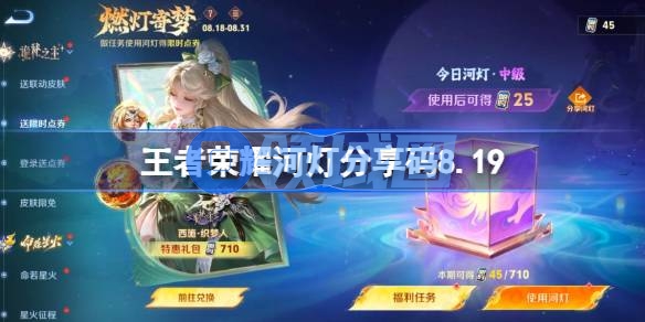 王者荣耀开启了燃灯寄梦活动,可以获得限时点券。在活动中玩家可以完成活动来获取一定的限时点券,通过其他玩家分享的河灯分享码可以获得更多的点券。那么王者荣耀河灯分享码有哪些呢?下面一起来看看王者荣耀河灯分享码大全8.19吧。