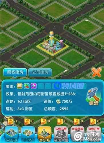 公司等级达到一定要求,则解锁对应建筑。购买街区之后,即可在街区上开设符合条件的建筑。修建建筑需要一定的费用,可以通过现金支付建造,现金不足可以使用金币补足。