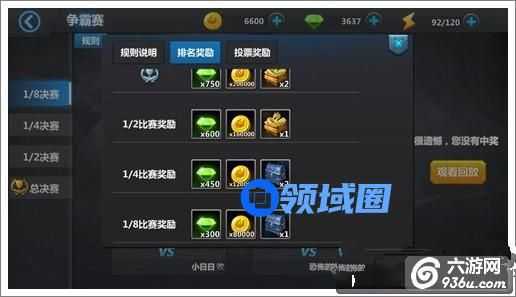每周六20:00会开放争霸赛,能进入争霸赛的只有参与竞技场后,到周六21:00为止积分排行前16的玩家,只要能进入1/8决赛,就能获得大量钻石奖励。
