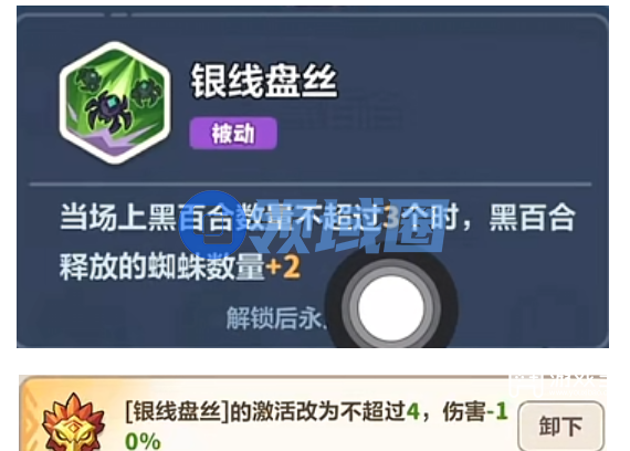 必带 “银丝盘线” ,因为黑百合的被动要求在场数量不能超过3个,否则会减少蜘蛛释放数量,但是在搭配上图腾后,则可以多上一只黑百合,对整体输出影响巨大