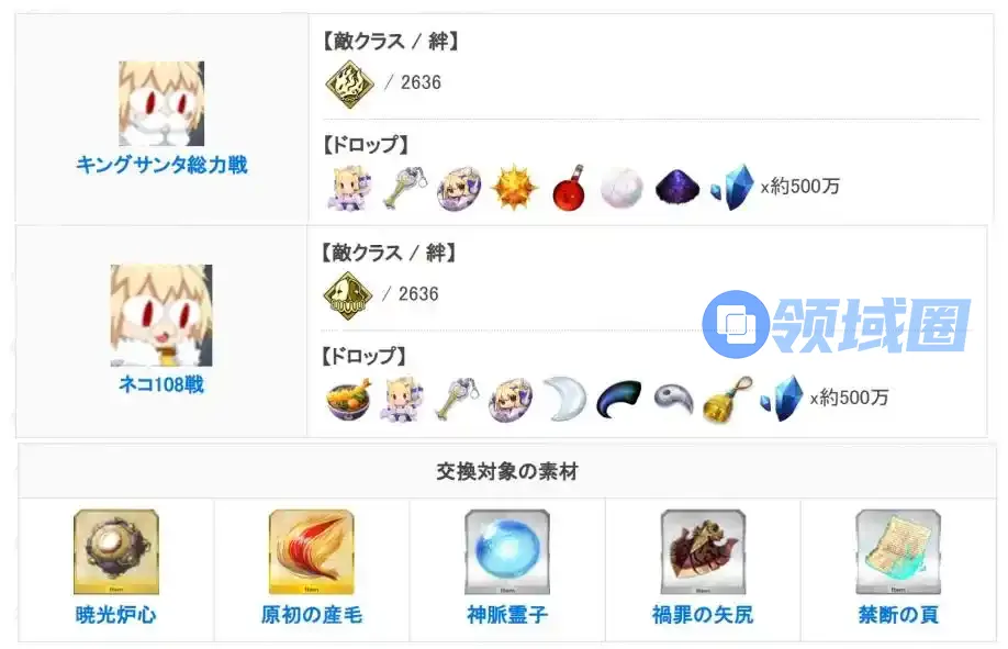 跟圣诞无限池无缝衔接的还有一个击退战,两次击退战有不同的素材掉落,不过击退战的素材掉率一直都比较一般,主要还是刷牵绊挖石头。第二次会掉落特殊道具,可以在商店无限兑换上图底下的5种材料,不过特殊材道具的掉率也比较一般。