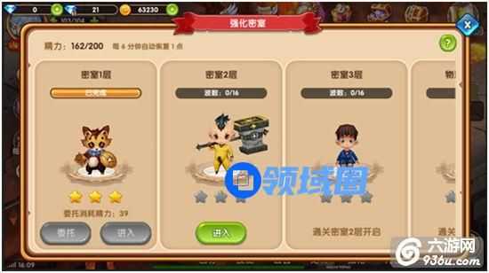 进入强化密室界面后从密室1开始挑战,每次挑战成功开放后续密室的挑战,等级越高可以挑战的副本也越多噢,获得的强化石也更多喔!
