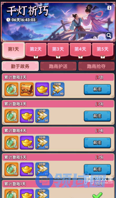 活动共五天,任务简单,做完共得1300个鹊翎珠。其中第二个有个限时一天的皮肤,如果周六没攻守城任务,可以考虑周日领取参加官渡。