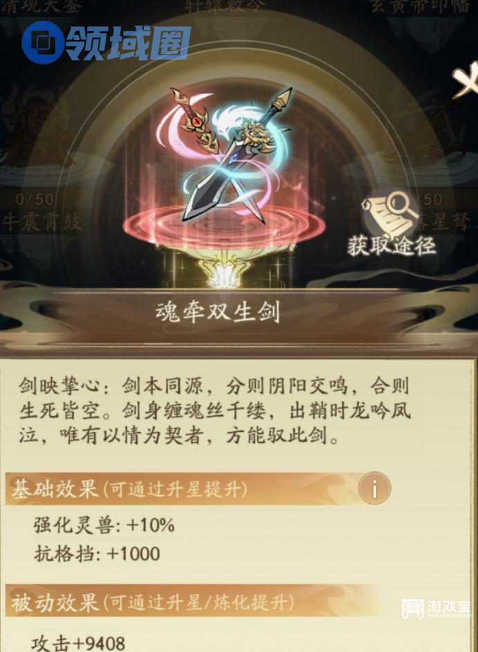 剑映挚手,魂牵双生,全新神话法宝「魂牵双生剑」加入成就奖励,激活后可获得强化灵兽、抗格挡以及攻击属性加成。
