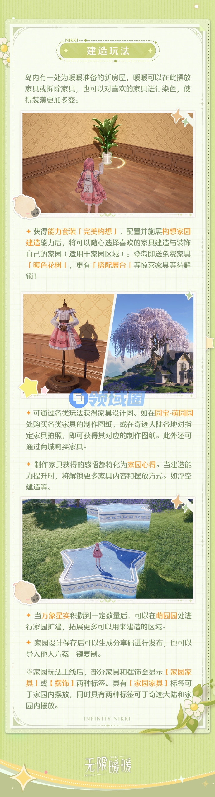 无限暖暖将在1.9音乐季版本中开启家园系统,相信大家都想知道这个家园系统究竟怎么玩吧,那么接下来就让领域圈小编为大家带来无限暖暖家园系统玩法攻略,一起来看看吧。