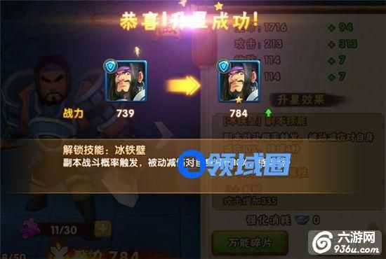 点击升星按钮。如果当前武将碎片足够的话,扣除一定数量的碎片完成升星。碎片相应升级后可解锁相应星级的技能。