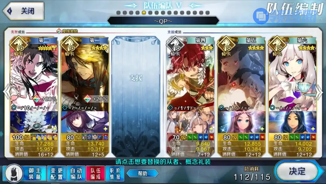 然后就是QP本,也算是日常本打得比较多的一个,跟其他队伍不一样的就是,这个本一般都是带满QP加成礼装,为了避免每次都要重新换礼装,所以单独做一个队伍就行了。至于打本的从者,就看个人的习惯了,想要双哈贝喵/双太公望+克制单体都行,个人是比较喜欢用双君11暴击队。