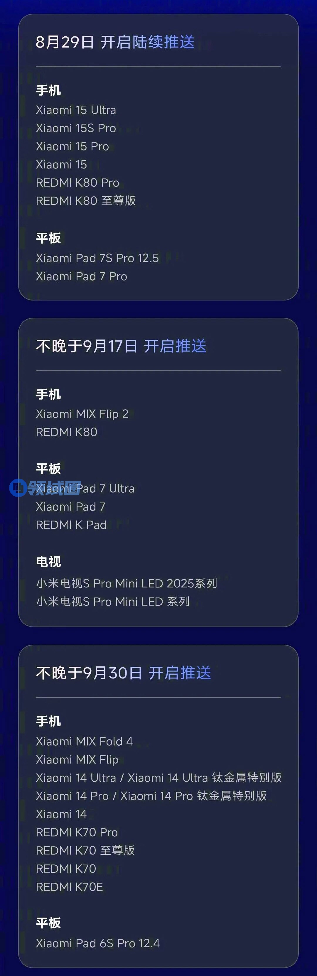 小米澎湃OS3.0bate已经在8月29日开启了首批推送,那么大家知道小米澎湃OS3.0其他手机什么时候可以更新呢?下面快跟随领域圈小编一起来了解一下小米澎湃OS3.0升级名单吧。