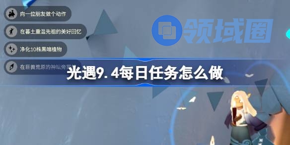 以上就是领域圈游戏为大家带来的光遇9.4每日任务怎么做解答,大家都了解了吗?还想要了解更多的内容那就请继续关注领域圈游戏吧。