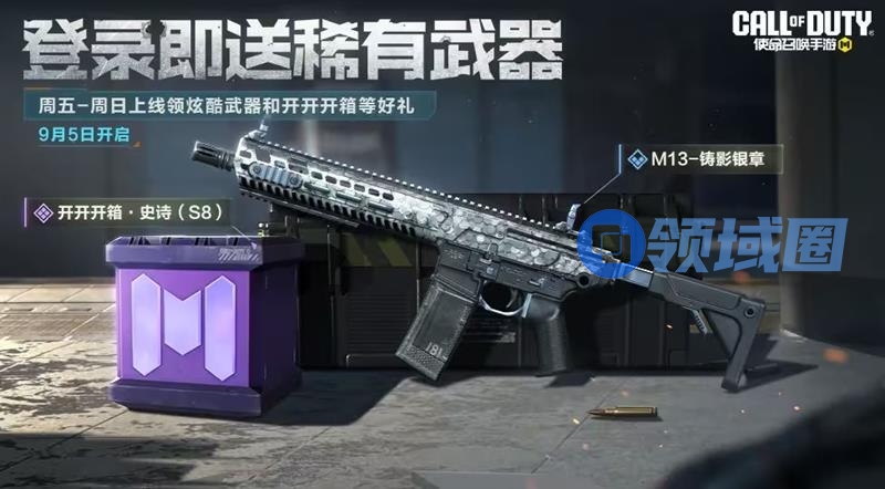 9月5日(本周五),周末登录礼上线。战士们在周末期间登录游戏,即可领取稀有级武器M13-铸影银章、开开开箱和任务卡等好礼,任务卡可用于快速完成福利手册的周任务,助你轻松完成周任务!
