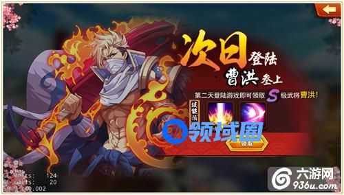 2、积极参加运营活动,目前第二天登陆是可以领取S级将领曹洪的哦,留意活动信息也许可以发现更多获取武将的好机会哦;