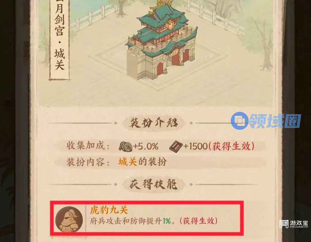 ④橙品县邑皮肤(花费300仙叶),二选一优先推荐城关,它可提高府兵攻击和防御两种属性!加的多!