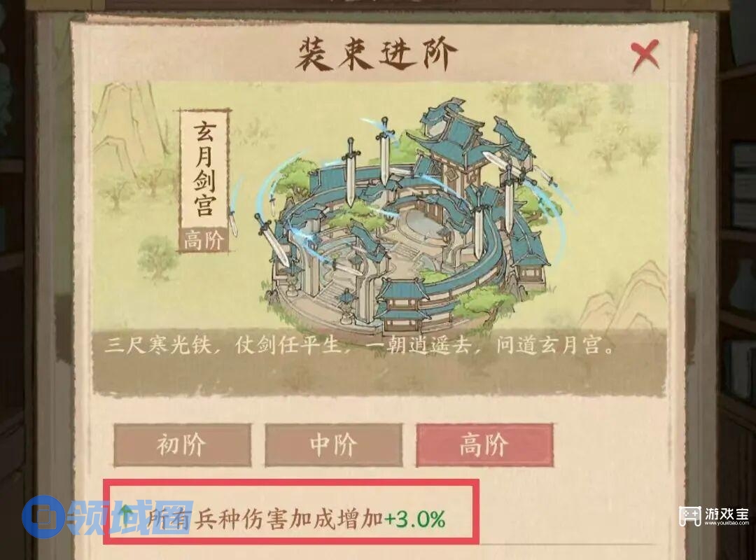 ⑤城皮玄月剑宫(花费1300仙叶),这城皮可增加各兵种的伤害(初阶1.5%,中阶2.25%,高阶3%)