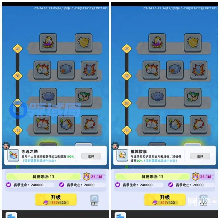 2、因为大家在赛季初期战力较低,尽快打秘境并提升科技到十级并选择【摧城拔寨】,到周三打完国战任务再根据自身的战斗力考虑是否更换为忠魂之勋。