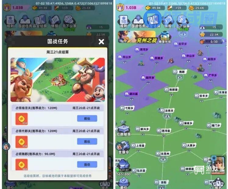 6、周三周五的国战任务,任务开始前先把路打通推到任务城之前,提前预留兵力保证晚上满状态进行任务。