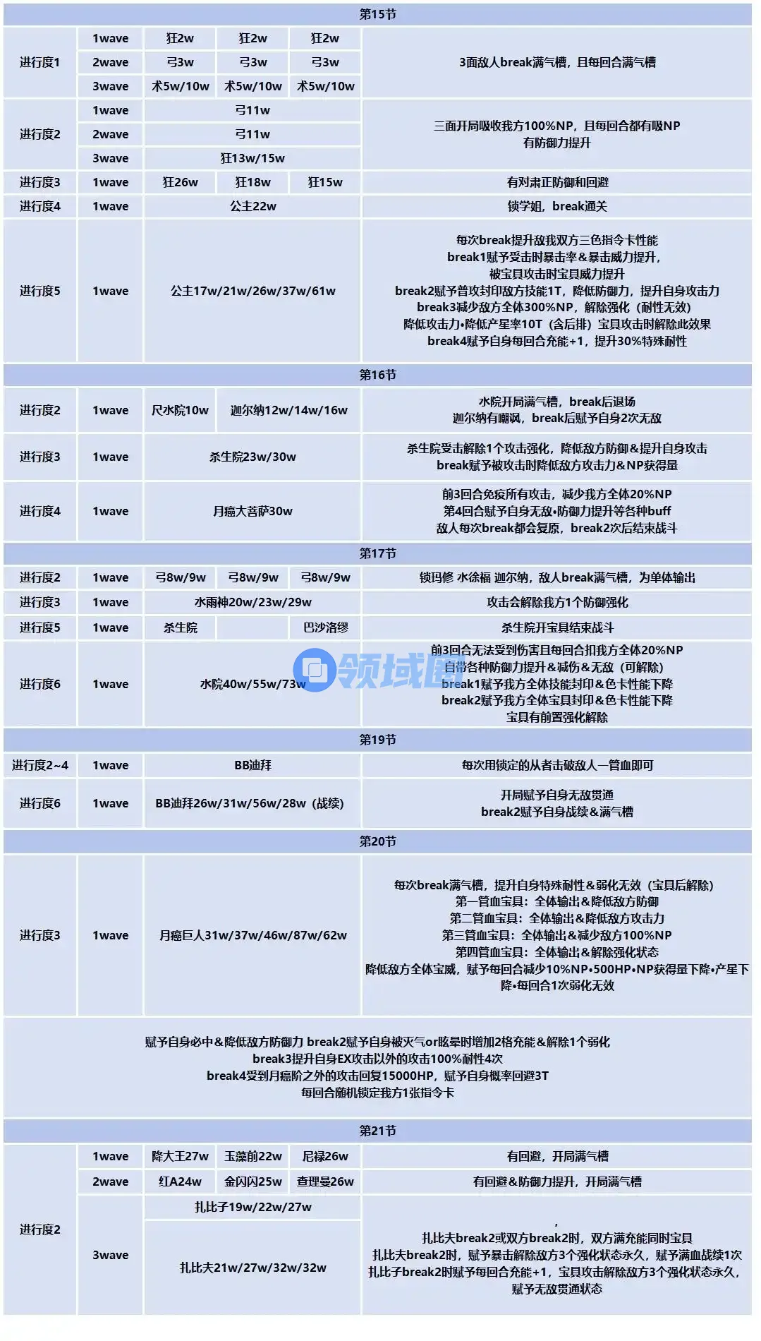 第20节进行度3就是本章难度最高的关卡,每次击破都会满气槽开宝具,且后面的宝具一次比一次恶心,第三管血的宝具是充能全灭,且会赋予自身100%特殊耐性,很难打得动,第四管血的宝具是强化解除,且有概率回避,每回合降低我方宝具威力和扣NP也很烦。