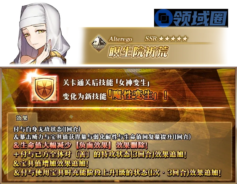 同时对杀生院的3技能进行强化,原本扣血的副作用取消,追加赋予己方全体20%~30%【善】特攻状态3回合,增加10%~20%群充,赋予全体使用宝具时充能阶段上升1级状态1次·3回合。