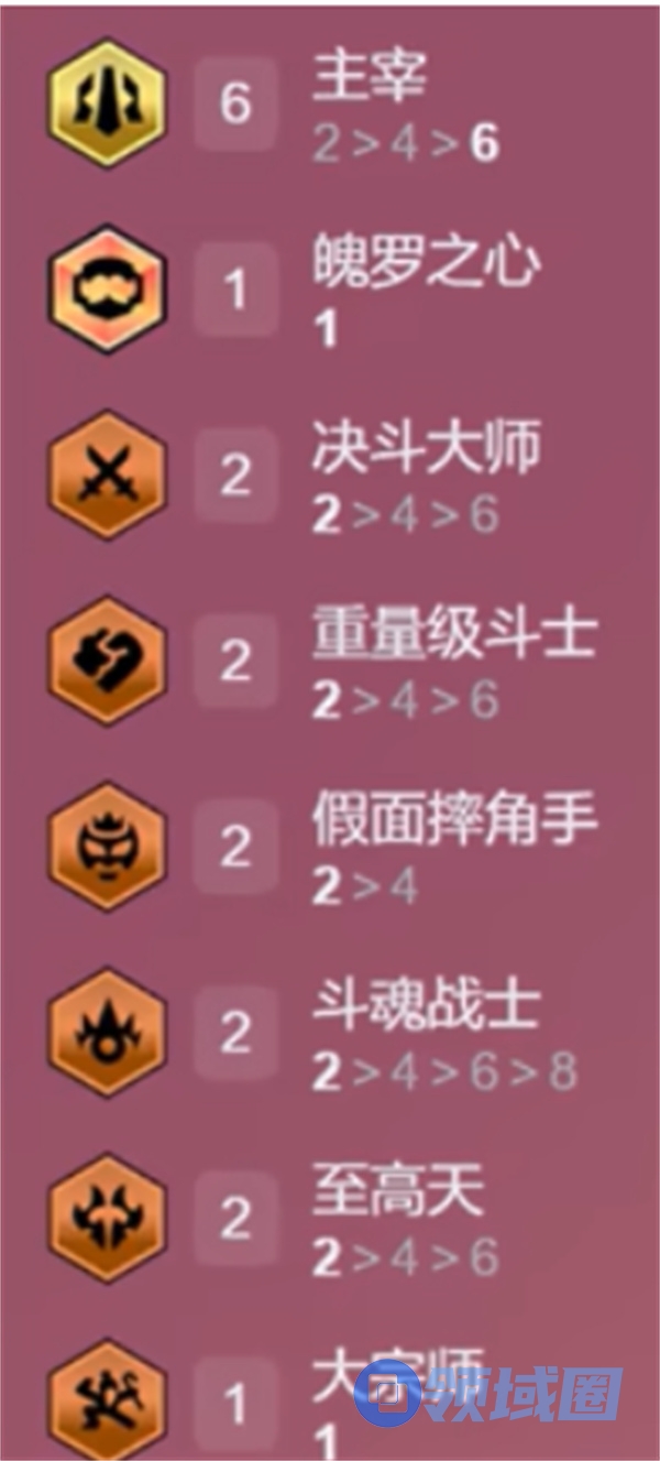 羁绊:6主宰+1魄罗之心+1决斗大师+2重量级斗士+1假面摔角手+1斗魂战士+1至高天+1大宗师