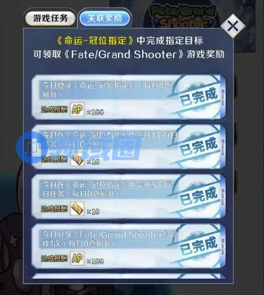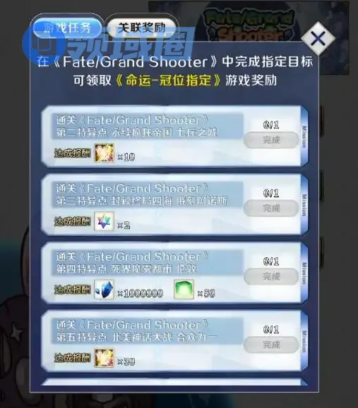 绑定之后就可以开始游戏了,点击小游戏主页上方的任务图标,可以看到两种任务,第一个是本体游戏的任务,在小游戏内通关不同篇章,最多可以获得10个圣晶石、40个五星狗粮、300万QP和50个绿方块,奖励还是很丰厚的。