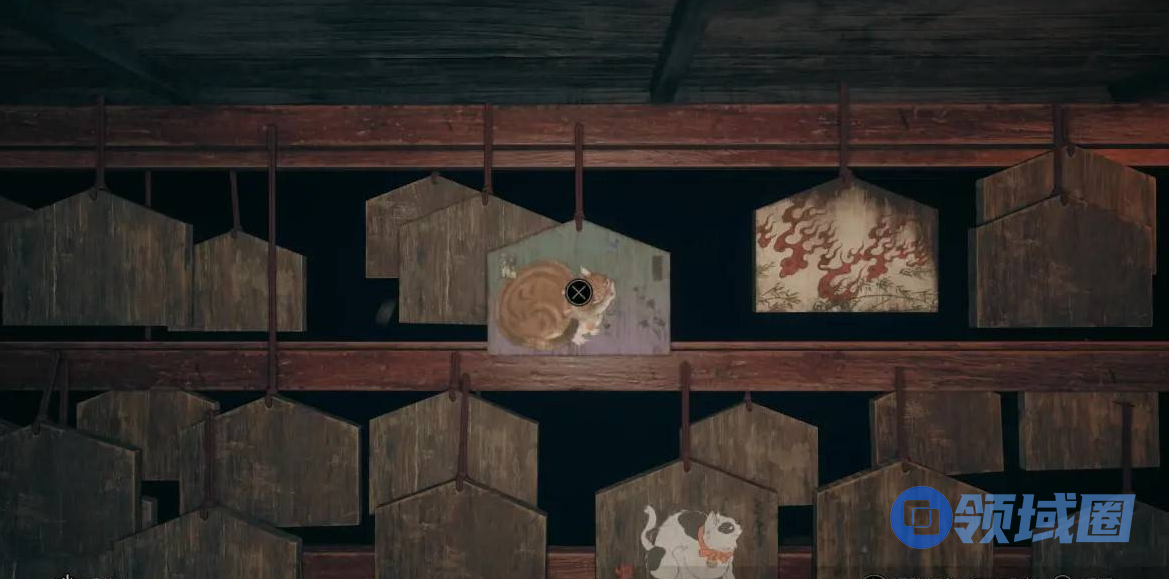 上个普通文档5背后的木架,再看左边的木架上,找到有猫图案的木牌,调查获得:御守【猫】。