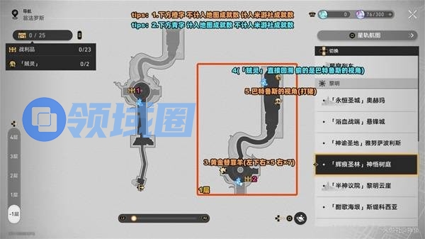 『「辉痕圣林」神悟树庭』35个战利品=「23个可见战利品」+「2个贼灵」+「4个巴特鲁斯的视角」+「4个黄金替罪羊」+「1个预言算碑」+「1个黄金短矛」。