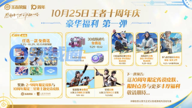 【免费送】参与活动即可免费兑换任一款:2-9周年限定皮肤与10周年限定史诗皮肤!(10周年限定史诗皮肤,将在活动结束后上架商城限时售卖)