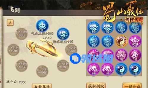 2、剑纹合成:剑纹合成分为一键合成和单个合成,一键合成将自动合成包裹内的白绿蓝品质剑纹,单个合成则可以指定任意剑纹进行合成升级操作;