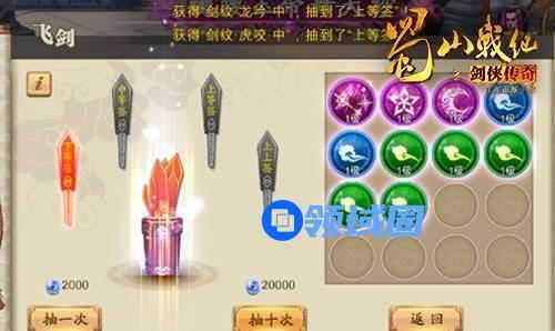 1、剑纹获取:通过“抽签”玩法消耗一定灵气可以获得剑纹,包括单个抽取和10连抽两种方式。每次抽取获得的剑纹将自动进入剑纹包裹中,包裹默认开启100个,花费一定绑定元宝可以最大开启200个;