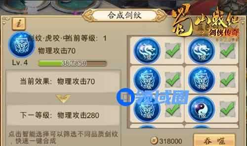 3、剑纹升级:每个剑纹都有自己的等级,通过吞噬剑纹提升等级则可以获得属性加成,剑纹品质越高所需经验越多。