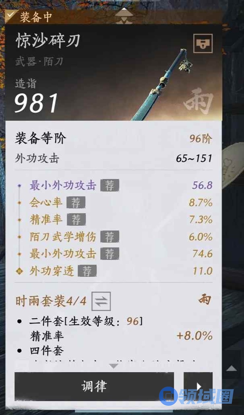 其他没有的不适合pve。虚构一个版本毕业面板大致为精准99%+,会意15%,会心56%,大攻3500必带陌刀增。