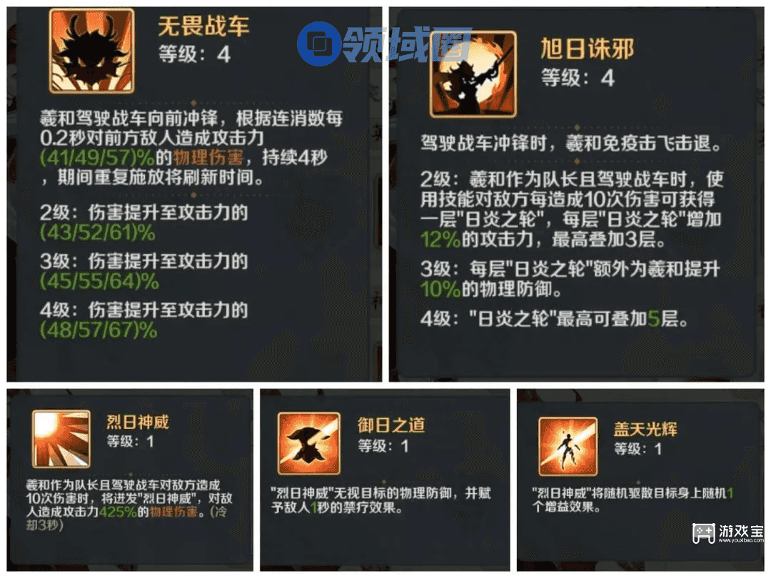 3、羲和:物理核心输出,靠战车冲锋快速打连击 → 堆叠“日炎之轮”提升攻击、防御,并能触发“烈日神威”打出大额爆发。带禁疗和驱散,克制回复型敌人。