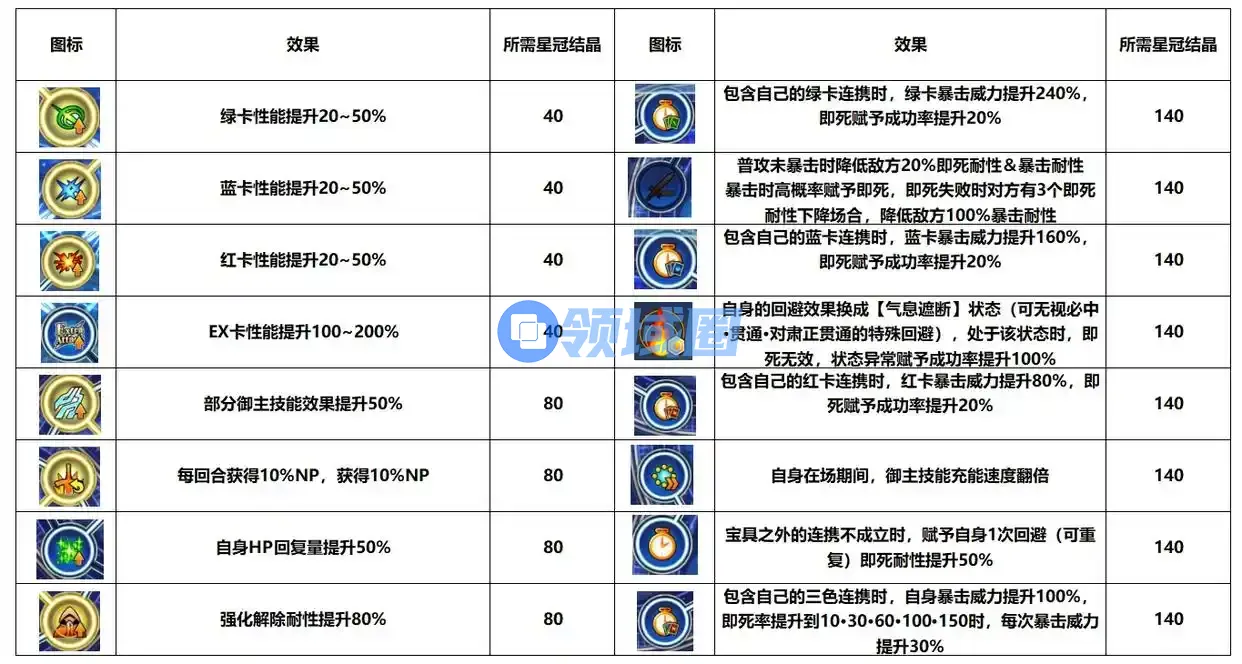 还可以获得五星纹章【告死之剑】,效果是刻印该纹章的指令卡攻击时,降低敌方单体30%即死耐性3回合,刻印改纹章的指令卡暴击威力提升15%,NP获得量提升5%,非常强的纹章,就是单纯作为暴击纹章来用也不错。