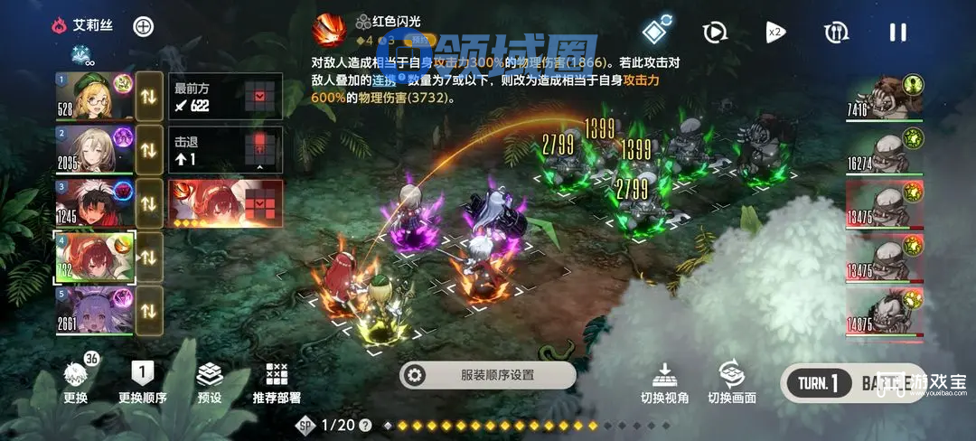 第一回合把威胁最大的+尽可能多清的杂兵,然后留意剩下杂兵攻击范围,调整角色摆放顺序(杂兵最好不要超过三个)。没打出爆伤就从新再打,如果出了爆伤伤害依旧不够就调整装备+属性。