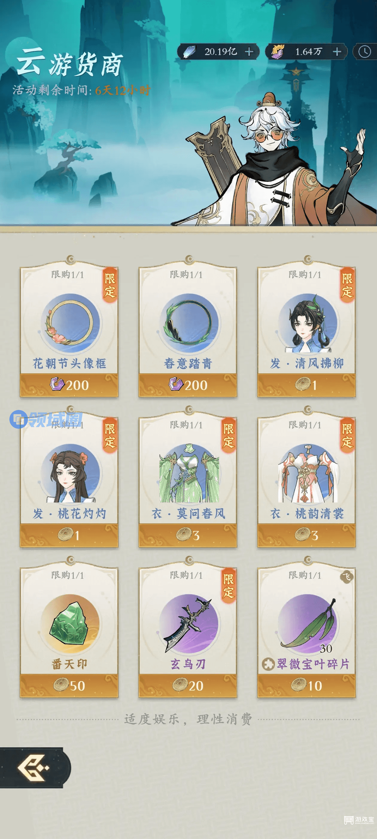 云游货阁:兑头像框、服饰等,公测番天印(含50长生通宝)按需换。