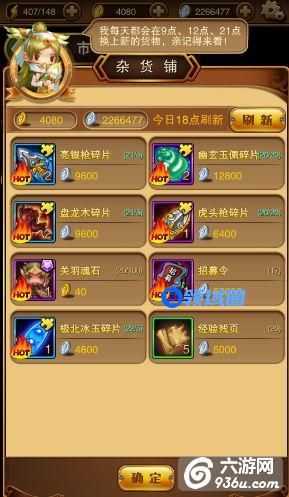 除了西域商人外,其他的商店都会出售武将魂石,装备碎片,经验卷轴,符文等材料道具,每天9点、12点、21点商店都会自动刷新,当然也可以消耗金币进行手动刷新。每次刷新都会随机刷新一些新的材料道具。