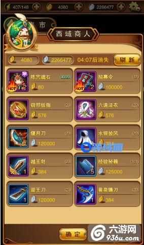 西域商人内只出售整件装备,经验书,高级招募令等高级道具,不过西域商人不是一直都在的,出现一会后就会消失,在商店的上方会有西域商人消失的时间显示,主公们要好好把握机会哦~