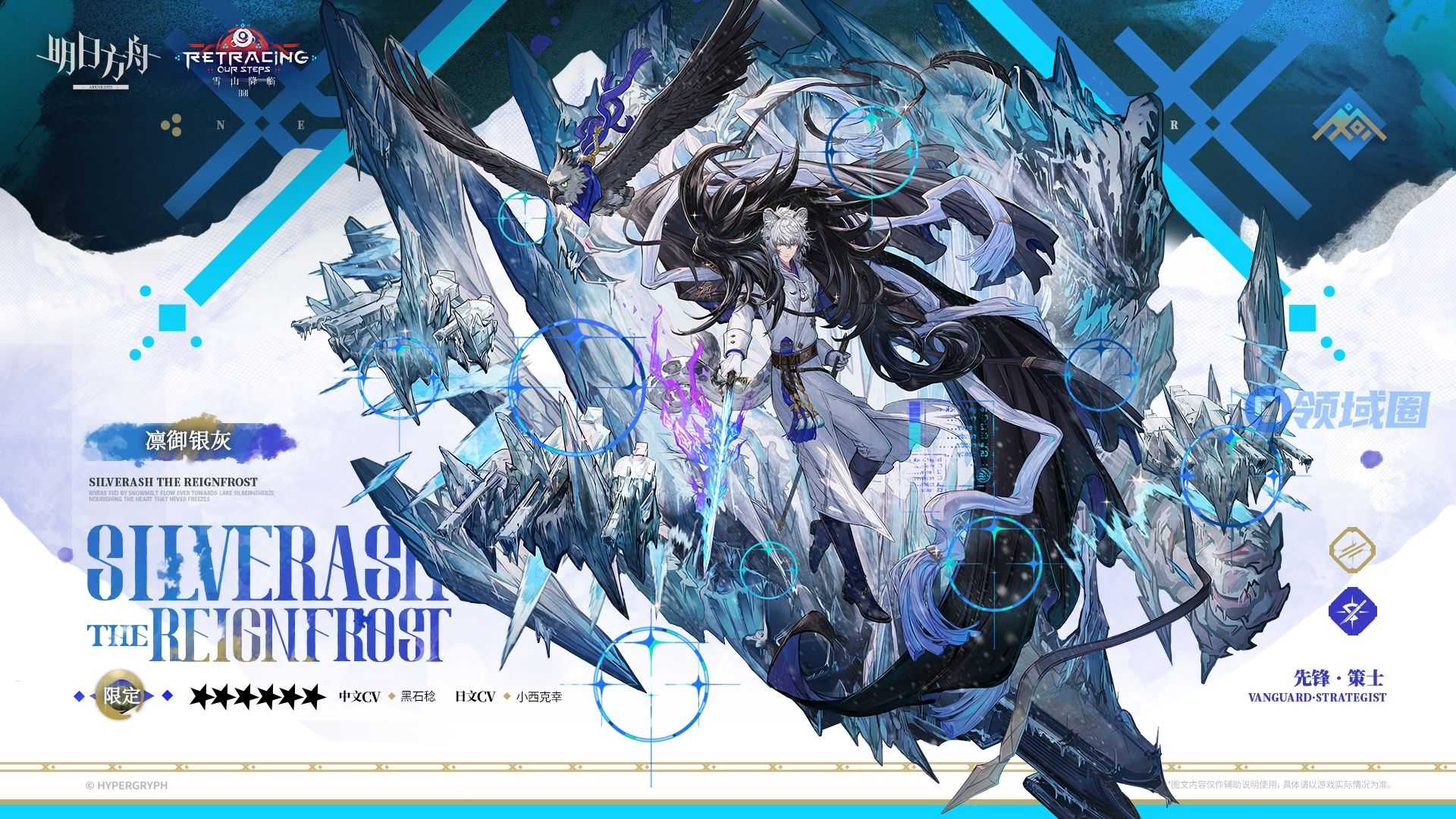 技能开启后,凛御银灰对前方数名敌人造成攻击力一定比例的物理伤害,使其数秒内寒冷且隐匿失效;待部署区距“风雪之眼”最近的1名干员费用降低(优先选择右侧近卫/术师/狙击干员);使“风雪之眼”左侧所有干员部署时以自身攻击力施放一次本技能的范围效果(最多叠加数次)