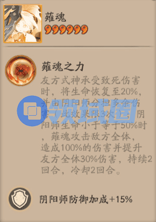 友方式神承受致死伤害时,将生命恢复至20%,并由阴阳师分担多余伤害(此效果限3次);阴阳师生命小于等于50%时,薙魂攻击敌方全体,造成100%的伤害并提升友方全体30%伤害,持续2回合,冷却2回合。