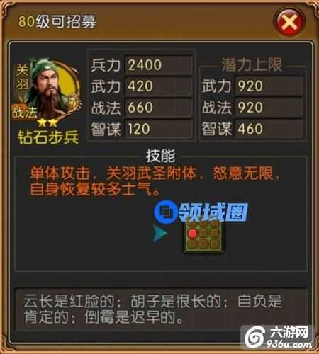 技能:单体攻击,关羽武圣附体,怒意无限,自身恢复较多士气。